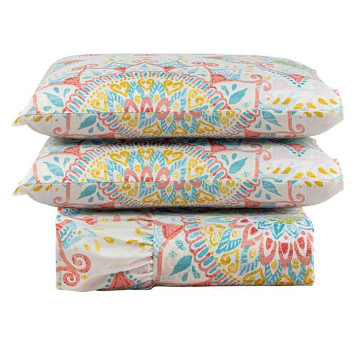 Kit Cobre Leito Colcha Turin Casal Estampada c/ Babado 400 Fios 3 Peças Mandala Vermelha Bege - Única