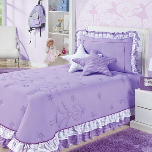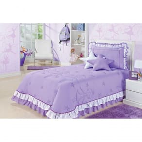 O Cobre leito Bailarina possui babado de poa com bordados do tema, acompanha Porta travesseiro com detalhes em viés e babado formando um lindo composê, e para deixar a cama bem completa, duas almofadas em formato de estrela compõe o Kit.