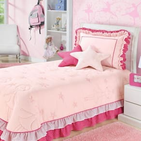O Cobre leito Bailarina possui babado de poa com bordados do tema, acompanha Porta travesseiro com detalhes em viés e babado formando um lindo composê, e para deixar a cama bem completa, duas almofadas em formato de estrela compõe o Kit.