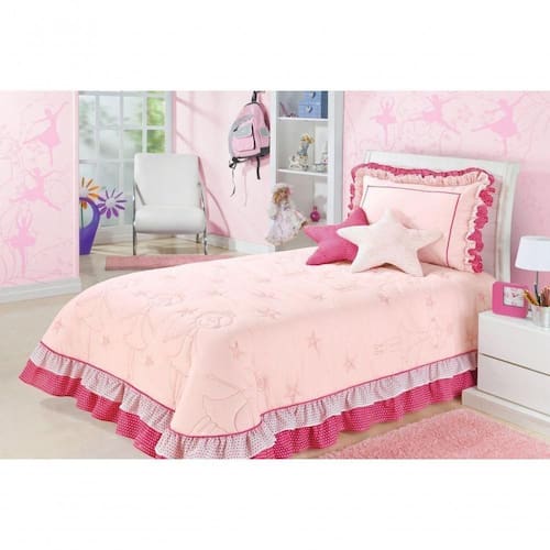O Cobre leito Bailarina possui babado de poa com bordados do tema, acompanha Porta travesseiro com detalhes em viés e babado formando um lindo composê, e para deixar a cama bem completa, duas almofadas em formato de estrela compõe o Kit.