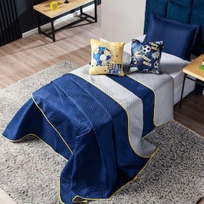 Confeccionado em tecido Microfibra Poliéster, a nova Coleção Futebol Goal vem trazendo um toque macio, com portas em acabamento debrum, o cobre leito com enchimento em manta dupla face, combinando cores modernas, permitindo o uso dos dois lados (Azul Marinho e Cinza), tudo para combinar com a sua decoração! Acompanhando duas lindas capas de almofadas estampadas digitais com zíper, facilitando a lavagem e o seu dia a dia para montar a cama do seu jeito! Produzido num rigoroso controle de qualidade, dando um toque de requinte para o ambiente. Confira!