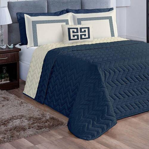 Kit Cobre Leito Queen Grecco Azul Marinho Casaborda 5 Peças O Cobre Leito Grecco é um produto completo, composto por 5 peças, dupla face e matelado. Lindo, moderno e com design super atual. Confeccionado na parte superior, inferior e enchimento com 100% poliéster. O porta travesseiro e almofada também são confeccionados em 100% poliéster. Os porta tarvesseiros possuem estampas clássicas.Composição:1 cobre leito 2,60m x 2,40m4 porta travesseiros 75cm x 55cm1 capa de almofada 35cm x 35cm1 refil de almofada 35cm x 35cm Tamanho - Queen