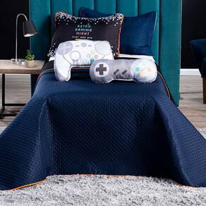Confeccionado em tecido Microfibra Poliéster, a nova Coleção Retro Game vem trazendo um toque macio, com portas em acabamento debrum, o cobre leito com enchimento em manta dupla face, permitindo o uso dos dois lados (Azul Marinho e Preto), com lindos detalhes nos porta-travesseiros estampados com viés em toda a volta, tudo para combinar com a sua decoração Gamer! Acompanhando também duas lindas almofadas em formato de controles de videogames antigos para sentir aquela nostalgia ao entrar no quarto, todas estampadas digital e com enchimento em silicone. Produzido num rigoroso controle de qualidade, dando um toque de requinte para o ambiente. Confira!