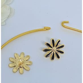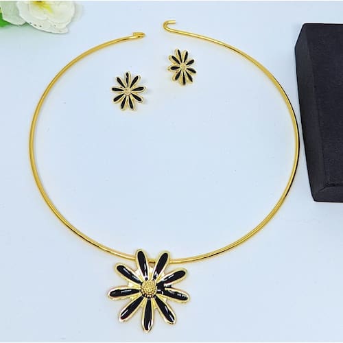 Kit Colar Choker Aro liso Rigido + Par de Brincos Antialérgico pingente Flor margarida Pétalas resinada Tendênicia - Cor: Preto