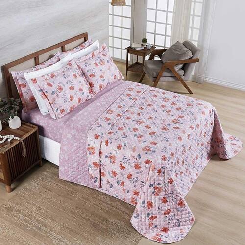 Kit Cobre Leito Colcha Belle King Estampado Dupla Face 400 Fios 3 Peças Floral Rosê Transforme o visual do seu quarto com o Kit Cobre Leito Belle, confeccionado em Micropercal 400 fios dupla face, que une a delicadeza do toque acetinado com a resistência e praticidade do tecido de alta qualidade.