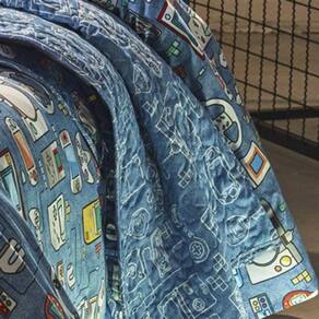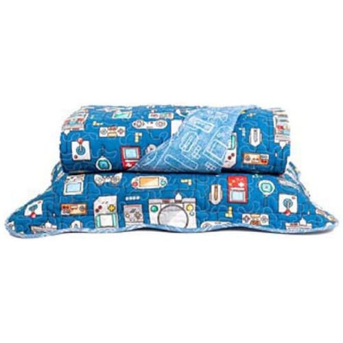 Características Composição: 50% Algodão 50% Poliéster Enchimento: 30% Algodão 70% Poliéster Acabamento: Micromatelassado Costurado e com Viés Detalhe com Frame e Porta Travesseiro com 3 Abas Dupla Face Estampa: Play Contém 02 peças Cor predominante: Azul Tamanho: Solteiro
