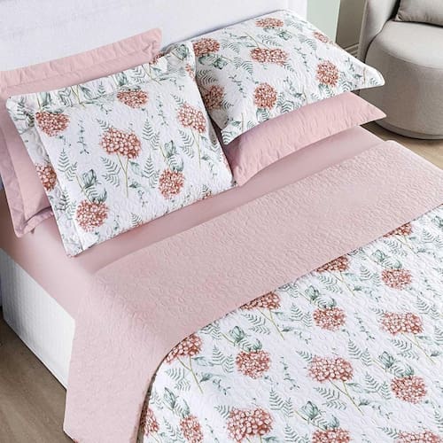 Kit Cobre Leito Colcha Maris Casal Padrão Estampado Dupla Face Percalle 200 Fios 3 Peças Hortênsia Salmão Kit Cobre Leito Maris - Conforto, resistência e beleza em cada detalhe