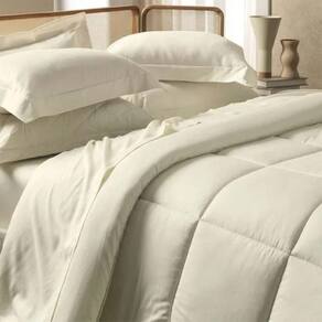 Colcha com cantos quadrados; Porta-travesseiro com 3 abas de 5cm; Matelassado; Antipilling; Hipoalergênico; Thermobond; Algodão Egípcio Penteado; Toque Supremo; Altamente respirável; Fácil de passar; Natural; Maleável e com ótimo caimento; Visual com leve brilho