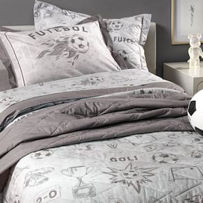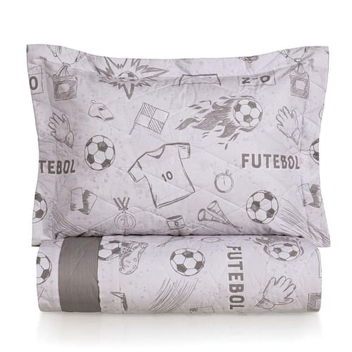 Apresentamos o incrível Jogo de Colcha Infantil Campeonato Karsten, perfeito para jovens fãs de futebol que vivem a emoção dos gramados. Na sofisticada cor cinza, esta colcha matelassada é adornada com uma estampa vibrante que inclui luvas de goleiros, bolas de futebol, chuteiras e troféus, capturando a essência do esporte e inspirando sonhos de grandes conquistas.