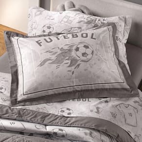 O porta-travesseiro, com três abas de 5 cm, complementa o conjunto com a mesma estampa dinâmica, proporcionando um visual harmonioso e esportivo. Confeccionado 100% em Algodão, o jogo de colcha Campeonato oferece suavidade e conforto, garantindo noites de sono tranquilas e aconchegantes.