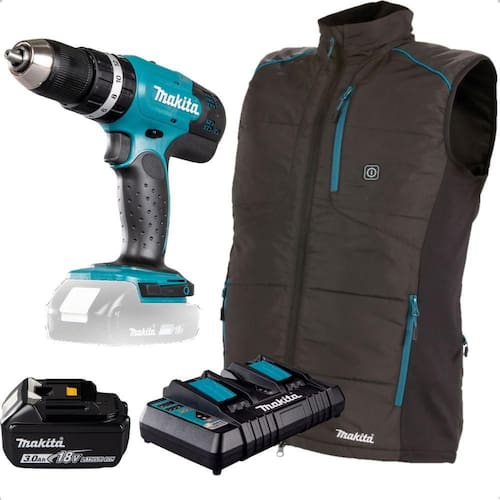 Kit Completo Makita: Colete Térmico a Bateria + Parafusadeira/Furadeira de Impacto + Bateria BL1830 + Carregador 110V + Bolsa
