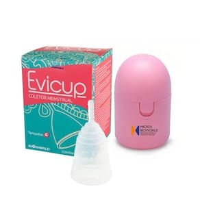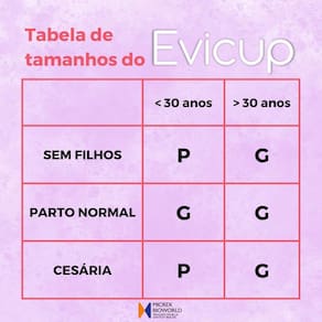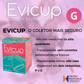 Kit Coletor Menstrual EVICUP G + Caixinha para esterilizar e guardar o coletor Kit Coletor Menstrual Evicup G + Caixinha Esterilizadora Evicup é um coletor menstrual fabricado com a mais alta qualidade de silicone medicinal sem corante em 2 tamanhos; Ginecologicamente testado. Destinado a recolher os fluxos menstruais, substituindo assim os absorventes descartáveis. Feito para a vida cotidiana, bem como a prática de todos os tipos de esportes, além de poder ser utilizado durante a noite de sono, sem se preocupar com vazamentos. Indicado para todas as faixas etárias, inclusive mulheres que utilizando contraceptivo do tipo DIU Mais prático, saudável, higiênico, confortável e ecologicamente sustentável, além de ser muito econômico, pois um Evicup pode ser por até 5 anos. Feito com silicone medicinal, totalmente antialérgico e seguro. O Tamanho G  grande  é recomendado para mulheres com mais de 30 anos ou que já tem filhos. O Tamanho P  Pequeno  é recomendado para mulheres com menos de 30 anos e que não tem filhos bem como para adolescentes, dependendo do tipo corporal. Toda vez que for removido e esvaziado, é recomendado a higienização do coletor menstrual com água e sabão, antes de reintroduzi-lo. Também é recomendado esterilizar o coletor menstrual antes do primeiro uso e após o final de cada ciclo de utilização, utilizando a Caixinha Esterilizadora Micrex-BioWorld. Totalmente destinada a esterilizar os copos menstruais no micro-ondas, trazendo mais praticidade e segurança comparado a esterilização feita no fogão. Feito com material próprio  polipropileno  para utilização no micro-ondas Advertências: - Este produto não é contraceptivo e não pode ser como tal. - Mulheres com prolapso, retroversão ou ante-flexão do útero, deve consultar um médico antes de iniciar o uso do coletor menstrual. - O coletor menstrual foi desenvolvido para atender a todas as faixas etárias das mulheres, entretanto aconselhamos que consulte seu médico ginecologista antes de iniciar o uso, principalmente nos seguintes casos: mulheres que ainda não tiveram a sua vida sexual iniciada, mulheres que utilizam algum tipo de contraceptivo interno  ex.: DIU , e mulheres que estão no período pós-parto. - Caso houver dificuldades para remoção do coletor menstrual, procurar ajuda médica o mais rápido possível. - Os coletores menstruais podem estar associados com a Síndrome do Choque Tóxico  SCT . Conservação: Temperatura ambiente