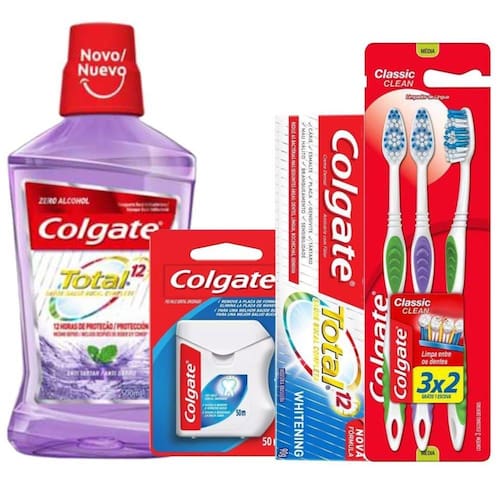 Kit contem: Enxaguante, Escova Dental, Creme Dental e Fio Dental ENXAGUANTE BUCAL COLGATE TOTAL 12 ANTI TÁRTARO O Enxaguante Bucal Colgate Total 12 Anti Tártaro previne problemas causados por bactérias, mantendo a sua boca mais saudável, também combate o mau-hálito e limpa em lugares difíceis de alcançar, mantendo a gengiva saudável. ESCOVA DENTAL COLGATE CLASSIC CLEAN - LEVE 3 PAGUE 2 A ESCOVA DENTAL COLGATE CLASSIC CLEAN garante uma higienização profunda e auxilia na remoção das bactérias prejudiciais causadoras do mau hálito. Proporciona resultado de DENTES mais brancos, protegidos e uma boca saudável. Além disso, a ESCOVA DENTAL COLGATE CLASSIC CLEAN garante maior conforto e praticidade na hora da higienização BUCAL. Alcança nas áreas de difícil acesso limpando perfeitamente sem agredir as gengivas. Seu material de qualidade permite fácil manuseio e durabilidade. Creme Dental Colgate Total 12h Whitening 90g - Colgate Total 12 Whitening refresca e branqueia os dentes enquanto remove suavemente as manchas superficiais. Ajuda a reduzir a placa bacteriana. Ajuda a reduzir o Tártaro, ajuda a prevenir a cárie e auxilia na redução das bactérias formadoras do mau hálito. FIO DENTAL COLGATE - 50M O FIO DENTAL COLGATE Total foi projetado para o uso diário fácil e confortável para os pacientes. O FIO COLGATE Total é feito de cera microcristalina, uma tecnologia avançada, que faz com que o FIO deslize facilmente entre os dentes se desfiar.