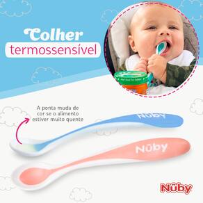 Ideal para as primeiras papinhas do bebêPonta macia e suaveA ponta da colher fica branca quando o alimento está muito quente, evitando possíveis queimaduras no bebêEmbalagem com 2 colheresLivre de BPA