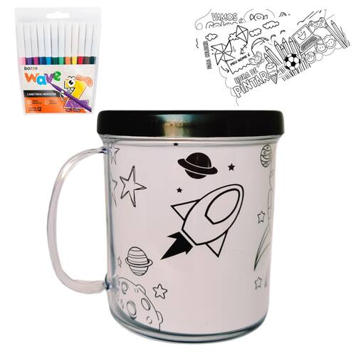 Kit Colorir Caneca Acrílica 350ml+ 12 canetinhas + 4 desenhoIdeal para presentear no dia das crianças, aniversário, lembrancinhas, etcPinte o desenho e depois encaixe na caixaconteúdo do kit01 - caneca acrílica com tampa rosqueável 350ml04 - desenhos impressos em papel fotográfico 180grs (sortidos)12 - canetinhas laváveis hidrográficas linha waveEspecificações TécnicasMaterial Tampa Rosqueável: Polipropileno (Plástico)Material Copo: PS Cristal (Acrílico)VALOR REFERENTE A 01 KITQuedas ou choques podem danificar o produto***Recomendamos retirar o papel de dentro antes de lavar Marca: LARANJA E MIMOS