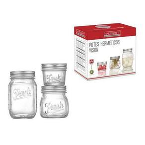Pote herméticos com tampa vison 3 peças - dimensões da peça: Pote pequeno: 7,2 x 7,2 x 5,9cm Pote médio: 8,1 x 8,1 x 9cm Pote grande: 7,9 x 7,9 x 13 - material: vidro e lata - cor: transparente com tampa prata - tipo de embalagem: caixa litografada - marca: haskraft - origem: china - capacidade: Pote pequeno: 110ml Pote médio: 320ml Pote grande: 490ml - espessura: 3,5mm borda - contém: 3 unidades - cuidados: Use somente esponja macia e sabão neutro. Não limpe as peças com esponjas ásperas, palha de aço ou produtos abrasivos. Enxágue com água em abundância. Para secar, utilize um pano seco e macio. - perigos: Evite pancadas, quedas e choques térmicos, produto frágil. No caso de quebra, poderá causar cacos cortantes e perfurantes. - advertência: O produto não deve ser Utilizado com intuito de aquecer alimentos em fornos, microondas, etc. Manter fora do alcance das crianças. - instruções de uso: Retire a tampa e adicione o alimento ao qual deseja armazenar, feito isso só fechar novamente. Indicado para armazenamento de alimentos.