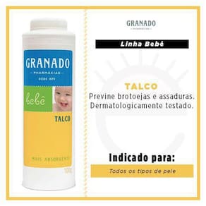 KIT COM 05 - Talco Bebê Granado - 100g cada KIT COM 05 - Talco Bebê Granado - 100g cada Talco Bebê Granado100gEAN: 7896512909190 Descrição Previne assduras e brotoejas. Formulado com amido de milho e óxido de zinco. Dermatologicamente testado. Livre de parabenos, corantes e ingredientes de origem animal.Corpo e Banho Granado Produtos que regeneram, hidratam e protegem a pele. Formulados com base vegetal e enriquecidos com extratos de plantas e ervas.Modo de Usar: Aplicar após o banho e a cada troca de fraldas, colocando na palma da mão e depois sobre a pele do bebê.A Marca: Pioneira na fabricação de sabonetes vegetais, a Granado é responsável pela maior produção do Brasil, e atravessa seus mais de 100 anos de existência com uma definida posição em relação à preservação do meio ambiente: desenvolver cosméticos formulados com extratos naturais, livres de corantes e de fragrâncias artificiais. Nenhum produto Granado é testado em animais.Quanto às embalagens dos produtos Granado, as caixas de sabonetes em barra trazem o selo FSC Forest Stewardship Council, ou Conselho de Manejo Florestal . Reconhecido mundialmente, o selo certifica que a madeira utilizada para a produção do papel "é oriunda de um processo produtivo manejado de forma ecologicamente adequada, socialmente justa e economicamente viável, e no cumprimento de todas as leis vigentes de árvores reflorestadas." Parte dos sabonetes que não possuem cartucho, são embalados em papel reciclado - a produção de papel reciclado consome menos energia elétrica, dispensa processos químicos e evita poluição ambiental. Em 2007, as sacolas de plástico das lojas - não biodegradáveis - foram substituídas pelas de papel.A busca por produtos cada vez mais naturais é um dos desafios da Empresa. Por isso, a Granado pretende continuar a crescer em parceria com a natureza e, acima de tudo, oferecer produtos de qualidade e com eficácia comprovada, a fim de promover bem-estar e equilíbrio entre o corpo e a mente.