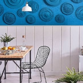 Material em poliestireno de alta densidade. Instalação rápida e sem sujeira. Produto pronto para pintura. Resistente à umidade. Imune à cupins. Não mofa ou apodrece. Usa somente cola, não sendo necessário parafusos , buchas ou outro tipo de fixação mecânica.
