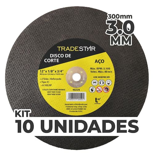 Kit com 10 Unidades Disco de Corte Metal 12 300x3,0 mm Furo 19,05 mm O Disco de Corte Metal 12 300x3,0 mm com Furo 19,05 mm, a escolha definitiva para profissionais que buscam desempenho superior e resultados precisos no corte de metais. Com um diâmetro de 300mm e uma espessura de 3,0mm, este disco proporciona cortes rápidos e eficientes em uma ampla variedade de materiais metálicos. Principais Características e Aplicações: Realize cortes precisos e eficazes em diversos metais, de aço a ferro fundido. Ideal para projetos industriais, construção civil e manutenção. Como Alcançar Resultados Extraordinários: Certifique-se de que o material esteja firmemente fixado e seguro antes de iniciar o corte. Utilize o disco em uma esmerilhadeira angular compatível com o furo do disco. Mantenha a esmerilhadeira em um ângulo apropriado e execute movimentos suaves para um corte uniforme. Benefício Central do Disco de Corte Metal: O Disco de Corte Metal 12 300x3,0 mm com Furo 19,05 mm é a ferramenta confiável que proporciona cortes rápidos e precisos, garantindo resultados superiores em cada aplicação. Adquira agora e experimente a potência e a precisão que farão a diferença em seus projetos de corte. Disco De Corte Para Aços Indicado Para Corte De Aços. 2 Telas/Reforçado. Tamanho: 12 300 Mm Espessura: 3,0 MM Furo: 19,05 MM Quantidade por embalagem - 10 unidades Garantia 90 dias após a compra. Imagens meramente ilustrativas As tonalidades da cor do produto podem sofrer alterações de acordo com a tela que estiver usando para visualização. Vantagens de Comprar com a JJC Ferramentas: Experiência e Confiança: Somos especialistas em ferramentas e acessórios, garantindo produtos de qualidade e desempenho superior. Variedade e Qualidade: Oferecemos uma seleção abrangente de ferramentas, sempre priorizando a durabilidade e eficiência. Atendimento Personalizado: Nossa equipe está pronta para ajudá-lo, oferecendo suporte técnico e orientações precisas. Entrega Rápida: Garantimos uma logística eficiente, assegurando que seu pedido chegue no menor tempo possível. Satisfação Garantida: Se por algum motivo não ficar satisfeito, oferecemos política de devolução sem complicações. Marca: Tradestar