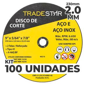 Kit com 100 Unidades Disco de Corte Metal 9 230x2,0 mm Furo 22/23 mm O Disco de Corte Metal 9 230x2,0 mm com Furo 22/23 mm, a ferramenta essencial para profissionais que exigem desempenho máximo e precisão no corte de metais. Com um diâmetro de 230mm e uma espessura fina de 2,0mm, este disco proporciona cortes rápidos e precisos em uma variedade de materiais metálicos. Principais Características e Aplicações: Realize cortes suaves e eficientes em diversos metais, de aço a ferro fundido. Ideal para projetos industriais, construção civil e manutenção. Como Alcançar Resultados Excepcionais: Assegure que o material esteja firmemente fixado e seguro antes de iniciar o corte. Utilize o disco em uma esmerilhadeira angular que seja compatível com o furo do disco. Mantenha a esmerilhadeira em um ângulo apropriado e execute movimentos suaves para um corte uniforme. Benefício Central do Disco de Corte Metal: O Disco de Corte Metal 9 230x2,0 mm com Furo 22/23 mm é a ferramenta confiável que oferece cortes rápidos e precisos, assegurando resultados impecáveis em cada aplicação. Adquira agora e experimente o desempenho máximo e a precisão que farão a diferença em seus projetos de corte. Disco De Corte Para Aço E Aço Inox Indicado Para Corte De Aço E Aço Inox. 2telas/Reforçado. Tamanho: 9 230 Mm Espessura: 2,0 MM Furo: 22,23 MM R.P.M.: 6.650 Quantidade por embalagem - 100 unidades Garantia 90 dias após a compra. Imagens meramente ilustrativas As tonalidades da cor do produto podem sofrer alterações de acordo com a tela que estiver usando para visualização. Vantagens de Comprar com a JJC Ferramentas: Experiência e Confiança: Somos especialistas em ferramentas e acessórios, garantindo produtos de qualidade e desempenho superior. Variedade e Qualidade: Oferecemos uma seleção abrangente de ferramentas, sempre priorizando a durabilidade e eficiência. Atendimento Personalizado: Nossa equipe está pronta para ajudá-lo, oferecendo suporte técnico e orientações precisas. Entrega Rápida: Garantimos uma logística eficiente, assegurando que seu pedido chegue no menor tempo possível. Satisfação Garantida: Se por algum motivo não ficar satisfeito, oferecemos política de devolução sem complicações. Marca: Tradestar