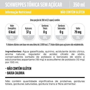 Ingredientes: Água gaseificada, quinino, acidulante ácido cítrico, aroma natural, conservador benzoato de sódio.