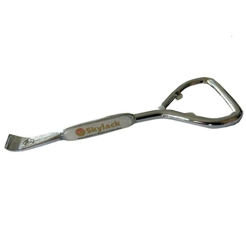 Abridor de Lata de Tinta - Skylack Seu design único permite abrir latas com fechamento plus, são confeccionados em aço carbono e cromo. Toda pintura começa com a abertura da lata de tinta. Quando uma lata de tinta não é corretamente aberta e ocorre sobra do produto, certamente esta sobra irá se deteriorar. A lata mal fechada deixa o ar entrar e o solvente da tinta sair, e surge uma pele ou nata em cima da tinta. Isso significa que a tinta estragou e não poderá ser utilizada novamente. Com o passar do tempo, a tinta se torna endurecida e terá que ser jogada no lixo. Tão importante quanto abrir a lata corretamente, o ato de fechá-la bem trará muita economia para seu bolso, e certamente, ele lhe agradecerá por isso. Por isso a Skylack desenvolveu abridores de latas de tinta em aço carbono, cromados. A ferramenta correta para um serviço perfeito.