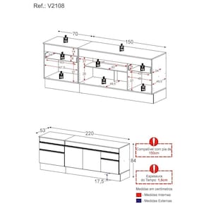 Dimensões do produto montado: Altura: 84cm | Largura: 220cm | Profundidade: 53cm (balcão com tampo) *Você pode consultar as medidas internas na imagem técnica do produto.