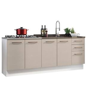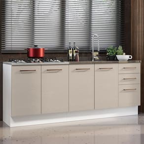 O acabamento da estrutura é branco e o das portas e frentes é na coloração Crema. É feito em Pintura Poliéster ecológica, com 7 camadas que protegem o móvel dos efeitos do álcool da água e do calor.