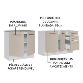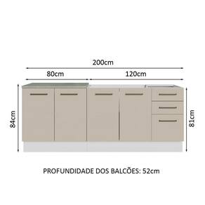 O balcão maior tem 120 cm de largura, com duas portas e três gavetas. Além disso, possui espaço para colocação de pia de inox ou pedra, na medida de 120 x 52 cm. O outro balcão possui 80 cm de largura, conta com duas portas e o tampo pode ser recortado para instalação de cooktop.