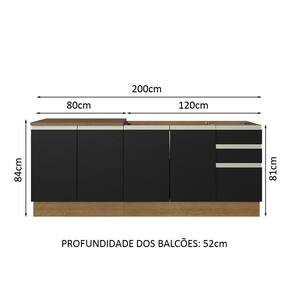 O balcão maior tem 120 cm de largura, com duas portas e três gavetas. Além disso, possui espaço para colocação de pia de inox ou pedra, na medida de 120 x 52 cm. O outro balcão possui 80 cm de largura, conta com duas portas e o tampo pode ser recortado para instalação de cooktop.