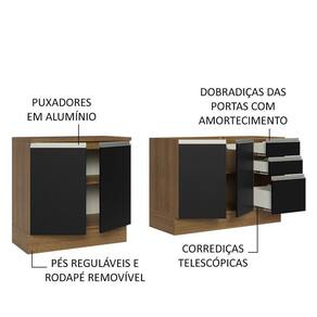 Os materiais utilizados na fabricação trazem resistência e durabilidade ao móvel. O kit conta com puxadores em alumínio, corrediças telescópicas nas gavetas e amortecedores para o fechamento suave das portas.