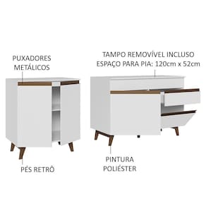 O balcão maior possui 120 cm de largura, com duas portas e uma gaveta. Além disso, o tampo pode ser removido para a colocação de pia de inox ou pedra, no espaço de 120 x 52 cm. O outro balcão possui 70 cm de largura, conta com duas portas e o tampo pode ser recortado para instalar um cooktop.
