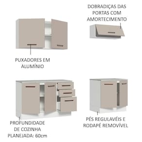 As portas são equipadas com amortecedores, assegurando um fechamento suave e silencioso, enquanto as gavetas com corrediças telescópicas possuem abertura total. Os puxadores, com alça em alumínio, oferecem durabilidade e praticidade no manuseio diário.