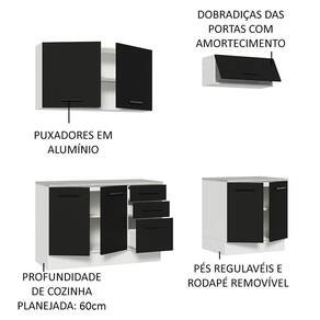 As portas são equipadas com amortecedores, assegurando um fechamento suave e silencioso, enquanto as gavetas com corrediças telescópicas possuem abertura total. Os puxadores, com alça em alumínio, oferecem durabilidade e praticidade no manuseio diário.