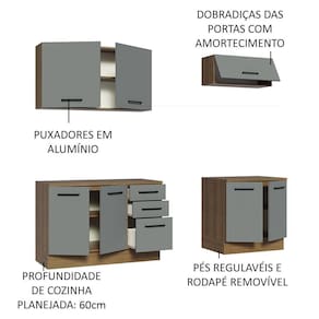 As portas são equipadas com amortecedores, assegurando um fechamento suave e silencioso, enquanto as gavetas com corrediças telescópicas possuem abertura total. Os puxadores, com alça em alumínio, oferecem durabilidade e praticidade no manuseio diário.