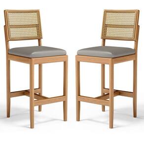 Kit Com 2 Banqueta Milena Madeira Maciça Assento Estofado Encosto De Tela Palha Sextavada Veludo Chumbo 109
