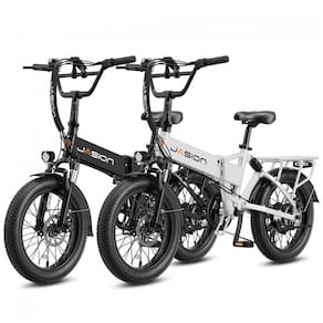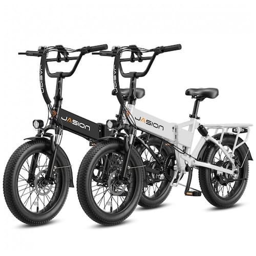 O kit com 2 bicicletas elétricas dobráveis Jasion EB7 nas cores preto jato e branco perolado é voltado para adultos que buscam um conjunto compacto de e-bikes com pneus largos 20x3 para uso urbano, deslocamentos diários e passeios em parques, ciclovias, praia e trilhas leves. Cada bicicleta utiliza quadro dobrável em liga metálica com suspensão dianteira, permitindo reduzir o volume para armazenamento em porta-malas de carro, apartamentos e espaços com área limitada. Os pneus fat 20x3, associados ao sistema de suspensão, contribuem para maior estabilidade, conforto e absorção de impactos em superfícies irregulares.