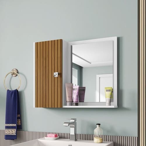 A Espelheira Gênova é tudo o que seu banheiro precisa. extremamente funcional ela possui uma porta que possui uma prateleira interna criando 2 nichos com amplo espaço interno, neles você poderá guardar todos os produtos de higiene pessoal que deseja, perfumes, shampoos dentre muito outros artigos de beleza que deseje armazenar na espelheira. Possui um amplo espelho fixado. Porta com pintura 3D efeito ripado. Altura do Conjunto: 47 cm Ambiente: null Ambiente Principal: Banheiro Cor: Branco/Ripado Informação Complementar: 2x Espelheira para Banheiro 1 Porta 2 Prateleiras Gênova Branco/Ripado Largura: 57,2 cm Altura: 47 cm Peso: 5,04 kg Profundidade: 12 cm Necessita Montagem: Não