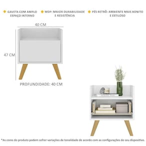 O Kit com 2 Mesas de Cabeceira 40 cm com Pés Retrô Multimóveis é uma solução prática para você deixar seu quarto mais bonito e complementar seu ambiente. Produzido em MDP com acabamento acetinado (cerca de 20% de brilho), que garante maior durabilidade e facilidade na limpeza, possui 1 gaveta com amplo espaço interno e corrediças metálicas que proporcionam mais leveza no manuseio. Os pés retrô, em polipropileno, dão um charme especial ao móvel deixando-o com um visual leve e permitindo você compor um ambiente com ar vintage e moderno ao mesmo tempo. Seu design clean permite que seja utilizado em diferentes ambientes, adaptando-se conforme sua necessidade.