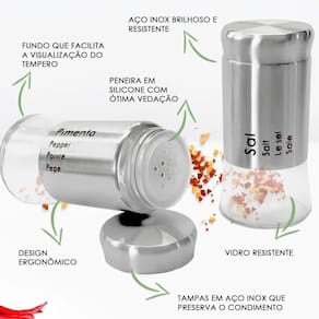 Este kit de porta temperos é a escolha perfeita para quem busca praticidade e elegância na cozinha. Composto por duas peças, cada porta tempero é feito de vidro e revestido em aço inox, garantindo durabilidade e um visual moderno. Leves e versáteis, são ideais para armazenar e organizar uma variedade de condimentos, como sal, pimenta, açafrão, alecrim, entre outros, mantendo-os sempre à mão durante o preparo das suas receitas.