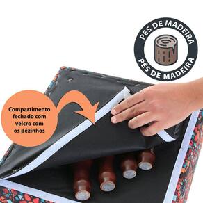 Estrutura: Madeira de Reflorestamento Pinus Espuma Superior: Poliuretano Densidade 18 (D-18) com 7cm de altura Estuma Lateral: Poliuretano Densidade 18 (D-18) Pés rosqueáveis de madeira com 15 cm de altura (com feltro para não riscar o piso) Compartimento para guardar os pezinhos