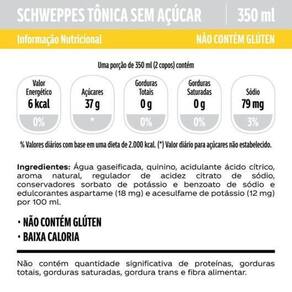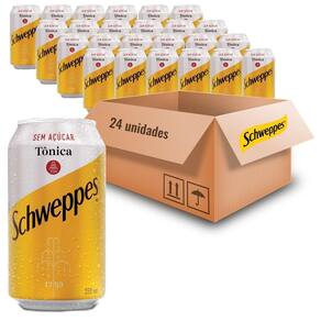 Produto: Kit com 24 unidades de Água Tônica SCHWEPPES Sem Açúcar 350ml. Ingredientes: Água gaseificada, quinino, acidulante ácido cítrico, aroma natural, conservador benzoato de sódio. Marca: SCHWEPPES. Origem: Brasil. Conservação: Armazenar em local fresco e seco. Após aberto, consumir imediatamente. Validade: Consultar embalagem.