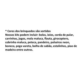 Contém:25 unidades brinquedos variados entre bolas, ioios, carrinhos varetas, chaveiros etc. . . Imagens ilustrativas idade mínima e máxima indicada de 03 à 99 anos. Cores dos brinquedos são nossos kits podem incluir: bolas, ioios, corda de pular, carrinhos, jogos, mola maluca, flauta, girocoptero, cobrinha maluca, peteca, pandeiro, pulseiras neon, boneca, pega vareta, bolha de sabão, estalinhos, piao de madeira entre outros. Homologação inmetro: 7351/2021-bri-22