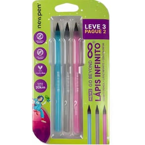 O lápis infinito da newpen equivale a 100 lápis comuns e possui uma tecnologia que consegue comprimir 100 grafites em nano partículas de grafeno, que é um material mais resistente que o grafite natural.