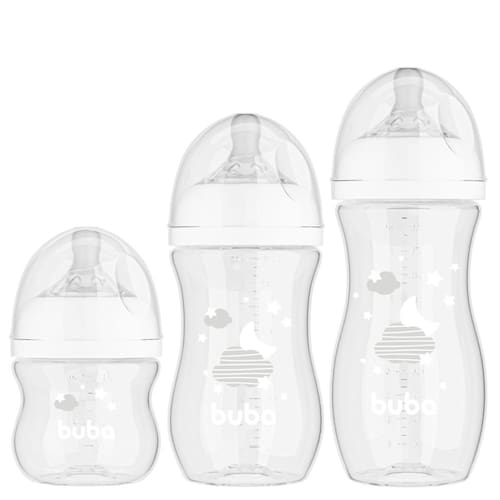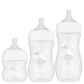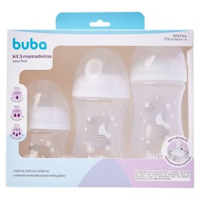 O kit inclui 3 mamadeiras com capacidade de 120ml, 270ml e 330ml e bicos fluxo tamanhos 1,2 e 3.