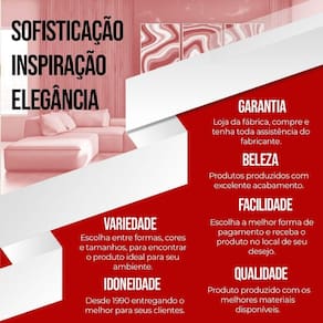Adquirindo os produtos de nossa empresa, além de contar com a sofisticação e com a qualidade conhecida em nossos catálogos, caso algum quadro apresente de fabricação, por sermos fabricantes, garantiremos a assistência dentro do prazo de noventa dias, a partir da data da do seu pedido. Nosso objetivo é proporcionar uma experiência agradável, assim como uma relação de confiança com o nosso cliente, sendo esta, sem dúvida, nossa maior satisfação.