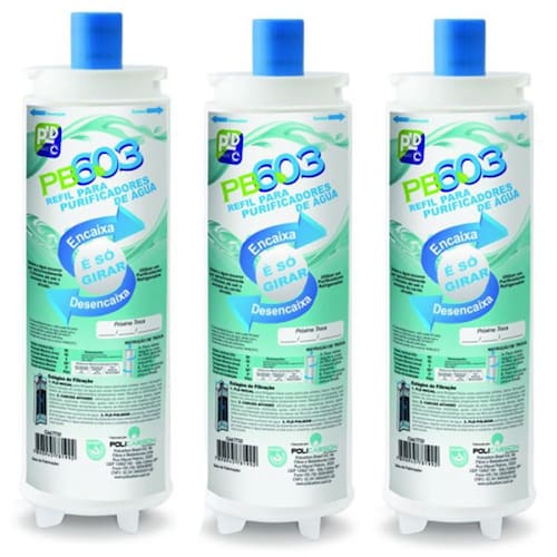 Refil Policarbon PB603 ao IBBL C+3  Girou/Trocou  Compatibilidade: FRQ600, ATLANTIS, BDF, PFN2000, PFQ2000, FR600 Este anúncio contém 3 unidades do refil Pb603 ATENÇÃO: Este modelo de refil NÃO serve no SPECIALE, IMMAGINARE e EXCLUSIVE. Recomendamos para estes modelos o refil da marca WFS modelo 027 OVER FLOW. Por Favor verifiquem o bico do seu respectivo refil com os da imagem do anúncio. Se forem diferente o modelo é outro e estou a disposição para ajudar. Os elementos filtrantes PB utilizam carvão ativado e o exclusivo sistema PLD PurityMax. Com três estágios de filtração, a água fica mais leve e cristalina, pronta para beber com saúde. O refil PB603 proporciona 3 estágios de filtragem: 1.PLD INICIAL para filtragem física, como partículas sólidas, barro, ferrugem, limo e redução de acidez da água. 2.CARVÃO ATIVADO elimina cloro, cloraminas, fenóis, algas, , , gosto, odor e reduz matéria orgânica. 3.PLD POLIDOR polimento, clarificação final da água, regula o pH através da dolomita em sua composição. Instruções de Troca: 1º Passo: Retire a tampa do seu purificador, gire o Refil no sentido horário para desencaixar do cabeçote. 2º Passo: Alinhe um novo Refil C+3 no purificador, encaixe-o empurrando-o para cima e gire no sentido anti-horário, coloque a tampa encaixando-a e espere ela fazer o barulho da trava. Pronto. Está feita a troca do seu Refil. 3º Passo: Após instalar o novo refil, deixe escoar a água desprezando-a para retirada de eventuais resíduos de carvão. Veja como fazer o processo para escoar a água nos modelos compatíveis da IBBL: -Altantis: Gire o botão "misturador" na posição natural, abra o botão "saída de água" e deixe escoar por 5 minutos. -BDF: Aparte a tecla natural  branca  e deixe a água escoar por 5 minutos. -FR600 e PFN2000: Abra as duas torneiras  natural e gelada  e deixe escoar a água por 5 minutos. -FRQ600 e PFQ2000: Abra primeiramente a torneira gelada e deixe escoar durante 5 minutos, após, abra a torneira de água quente e deixe escoar durante 3 minutos.