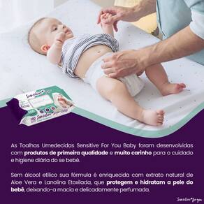 As Toalhas Umedecidas Sensitive For You Baby, são recomendadas para auxiliar na higiene durante as trocas de fraldas e por sua praticidade e eficiência. As propriedades do Aloe Vera e Lanolina Etoxilada hidratam a pele do bebê com suavidade e evitando seu ressecamento e assaduras.