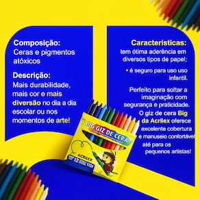 Kit com 3 caixas de Giz de Cera Big Acrilex, ideal para atividades escolares e recreativas. Cada caixa contém 12 cores vibrantes, com textura macia e excelente cobertura. O formato Big facilita o manuseio pelas crianças, oferecendo mais conforto e resistência durante o uso. Produto de alta qualidade, indicado para estimular a criatividade e a coordenação motora. Dimensões da caixa: 14 x 14 x 4,5 cm. Ideal para escolas, professores, pais e uso doméstico.