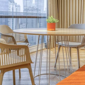 A cadeira Montreal possui assento em polipropileno, com estofado em couro ecológico. Seu encosto, levemente curvado e vazado, traz leveza ao ambiente. Ideal para compor espaços com estilo urbano, que está em alta na decoração!
